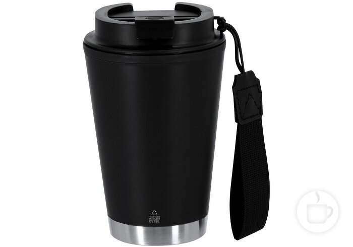 Kelioninis puodelis dvigubomis sienelėmis iš perdirbto plastiko su perdirbto plieno dugnu ir riešo juostele